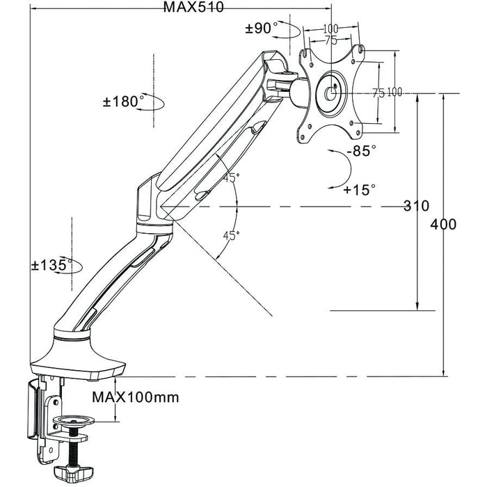 Gladius arms allow mounting of monitors with 75mm or 100mm VESA hole centres.