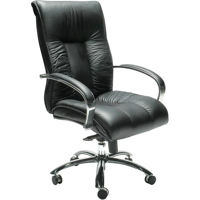 Sink into the puckered real leather upholstery. Lean back and lock while you ponder the world and how to conquer it. Leather padded arms and polished chromed metal base and arms exude authority.