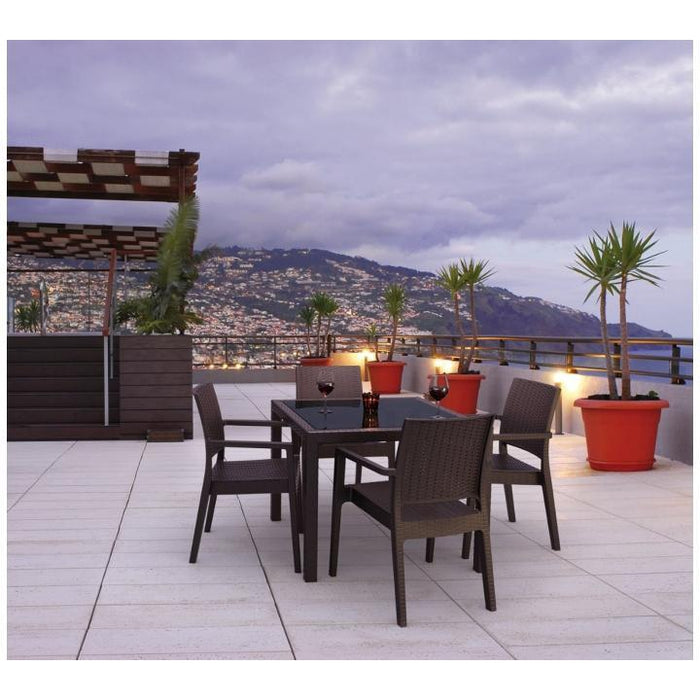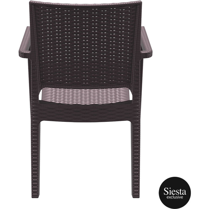 The Ibiza Armchair is an injection moulded resin chair, the non-metalic frame will never unravel, rust or decay, with rattan look seat and back. Reinforced with glass fibre to strengthen the legs and boost the weight capacity. The Ibiza Armchair is stackable, designed for outdoor use, UV stable and weather proof, it will not fade or go brittle in Australia’s harsh outdoor conditions. Strong yet lightweight, this chair will add class to your venue. It’s sleek profile is pleasant to the eye so this chair is as charming as it is functional. Very easy to clean, just hose it down.