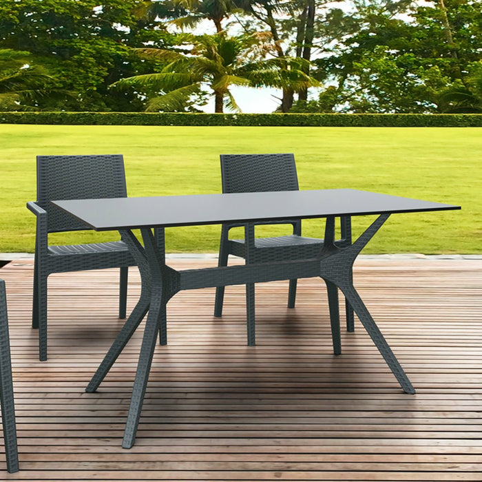 Table with rattan leg with HPL compact laminated tops 12 mm available in dark grey, brown and white colours. For indoor and outdoor use. Can be disassembled.