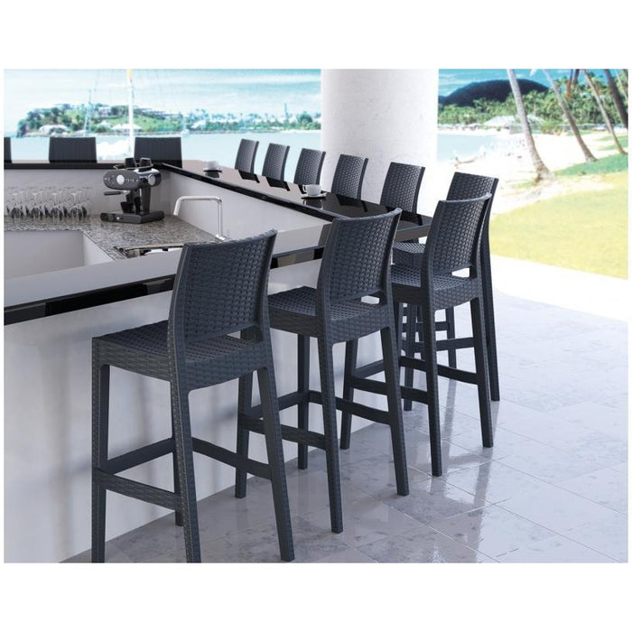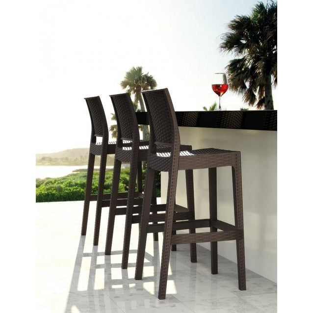 The Jamaica Barstool is an injection moulded resin chair, the non-metalic frame will never unravel, rust or decay, with rattan look seat and back. Reinforced with glass fibre to strengthen the legs and boost the weight capacity. The Jamaica Barstool is stackable, designed for outdoor use, UV stable and weather proof, it will not fade or go brittle in Australia’s harsh outdoor conditions. Strong yet lightweight, this stool will add class to your venue. It’s sleek profile is pleasant to the eye so this stool is as charming as it is functional. Very easy to clean, just hose it down.