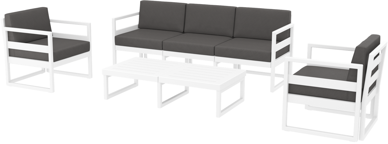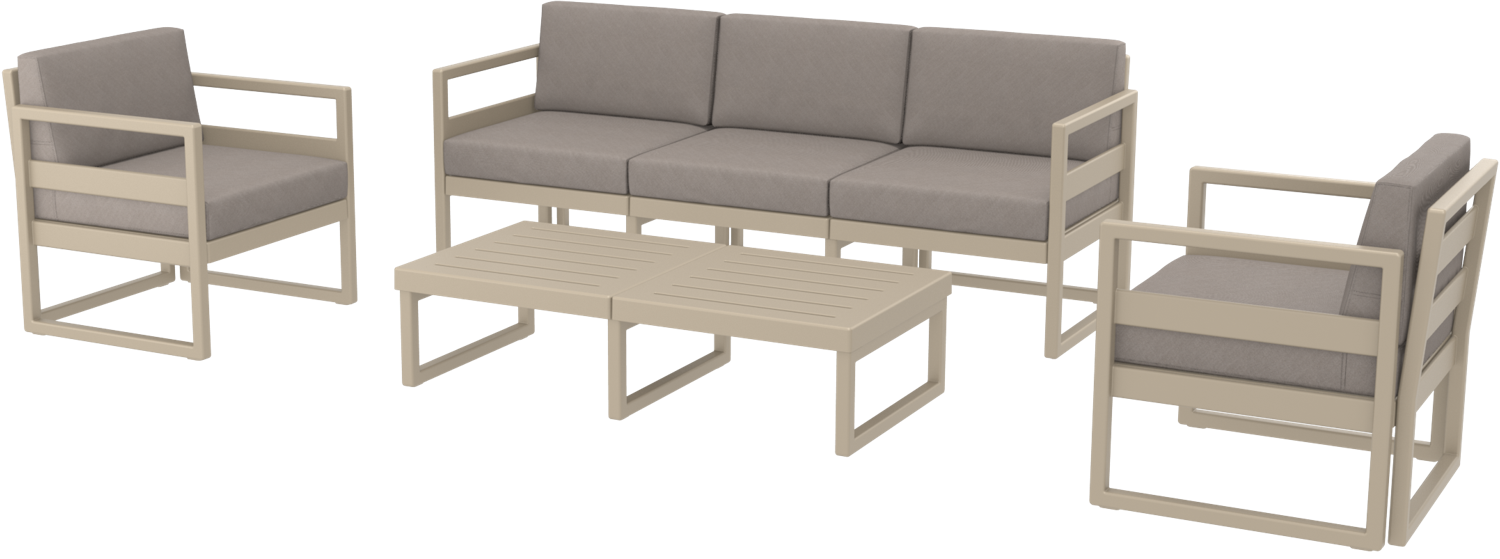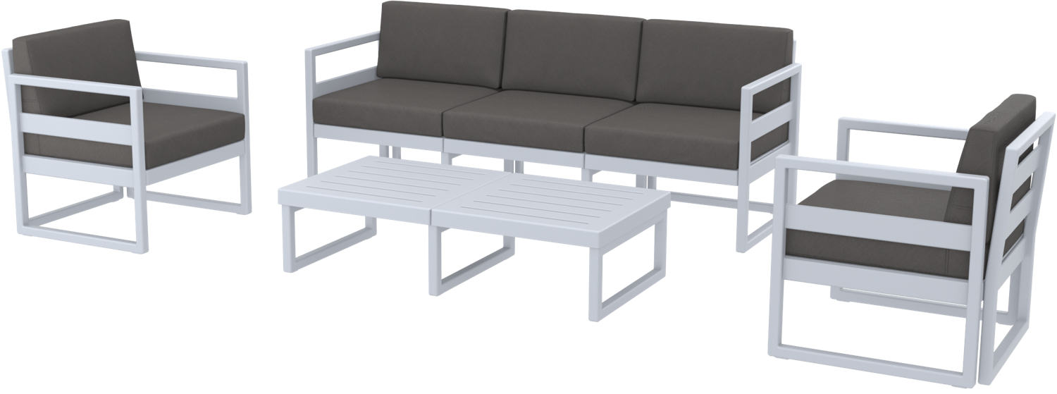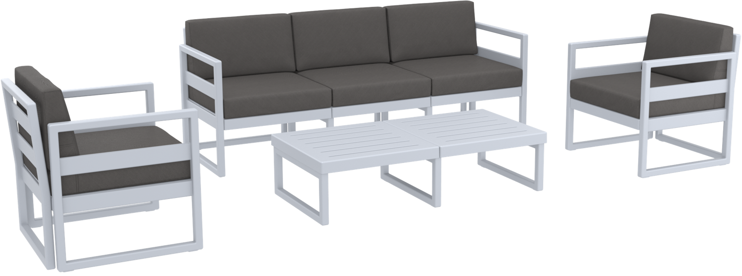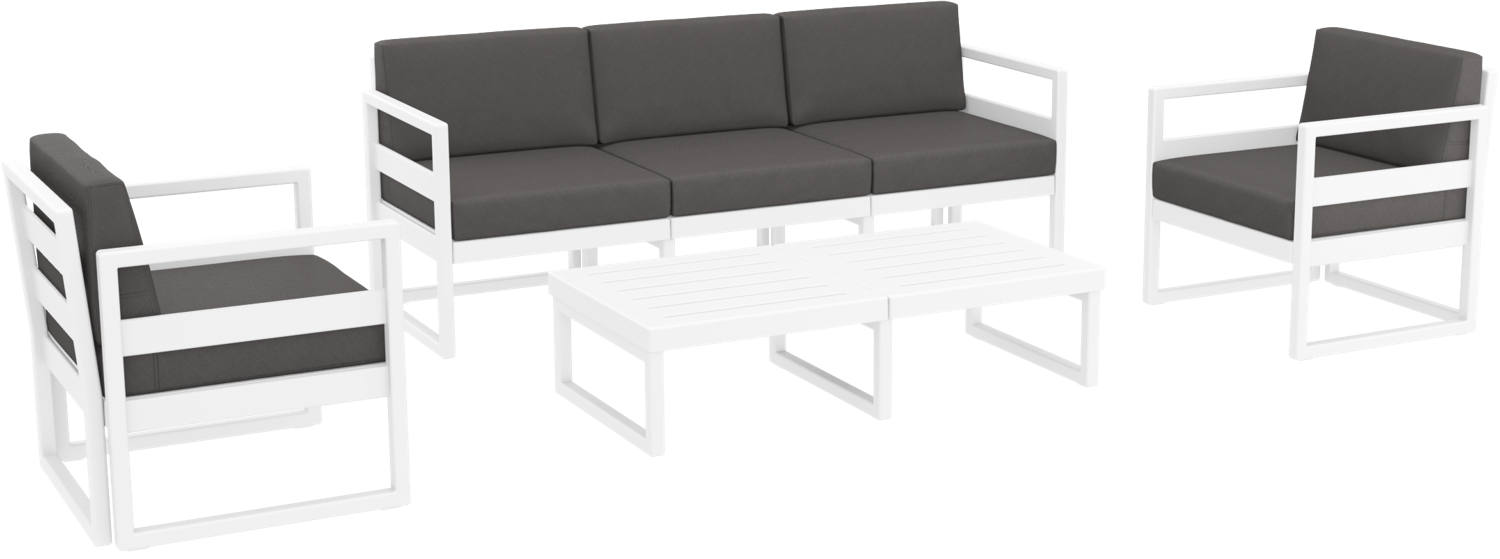 - Package includes 3x Mykonos Lounge Armchairs (with cushions) 2x Mykonos Extension Parts (with cushions) & 2x Mykonos Lounge Tables