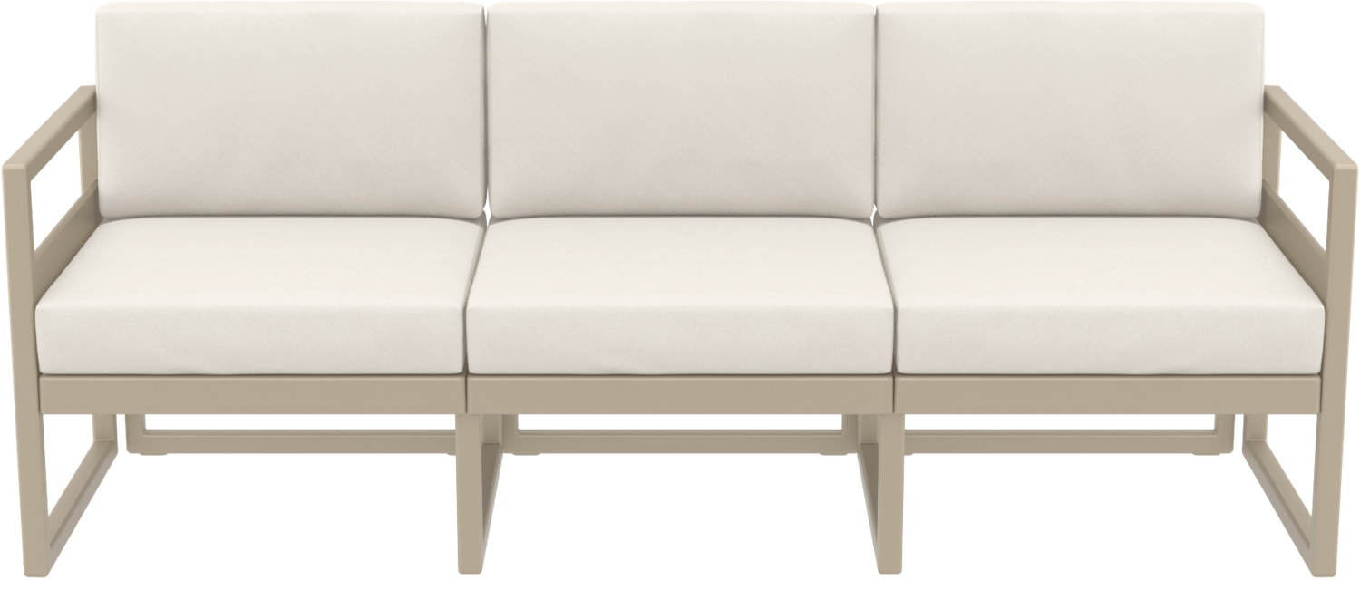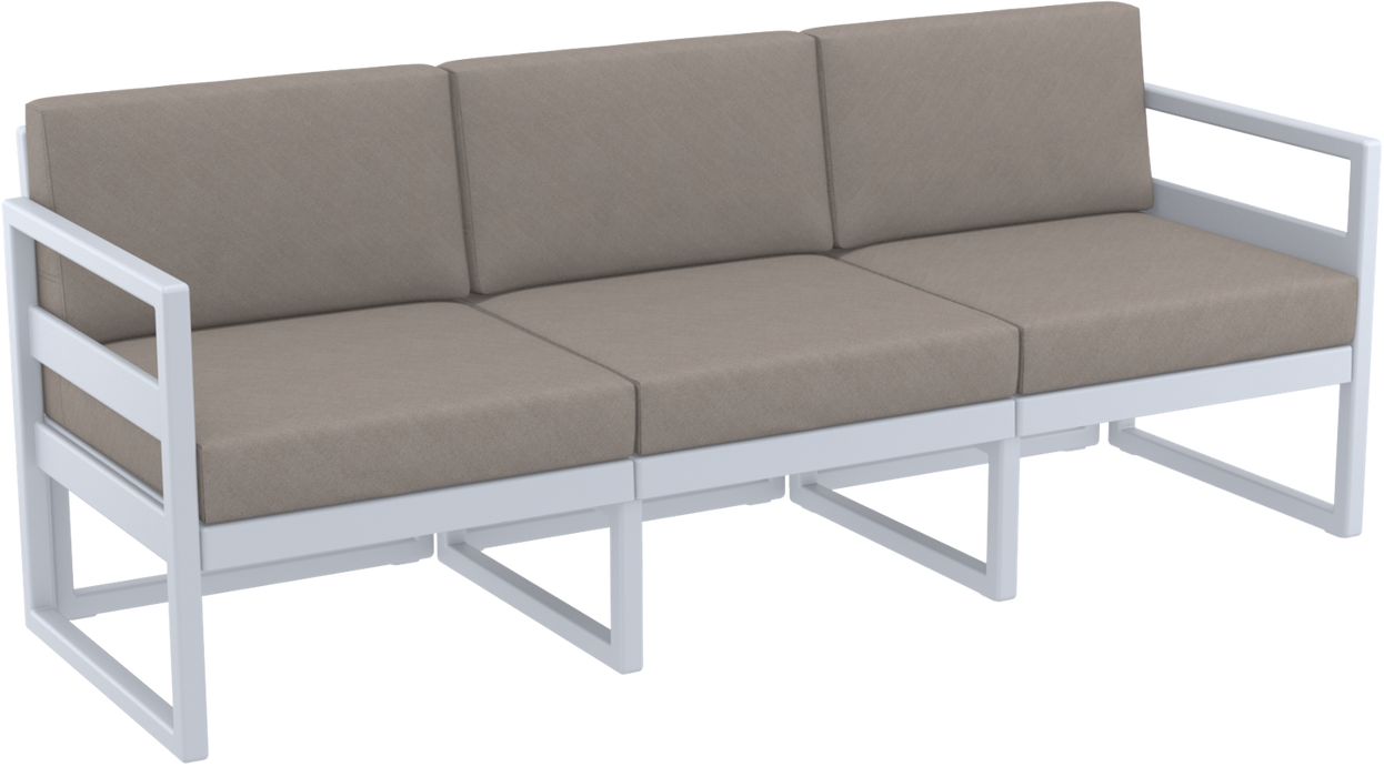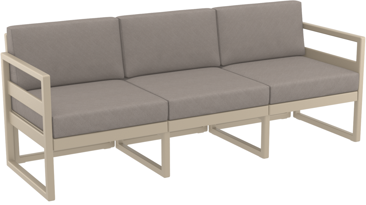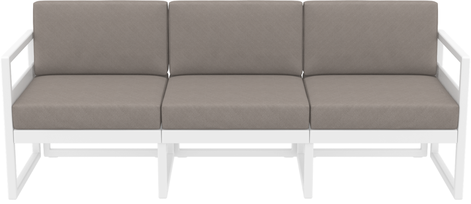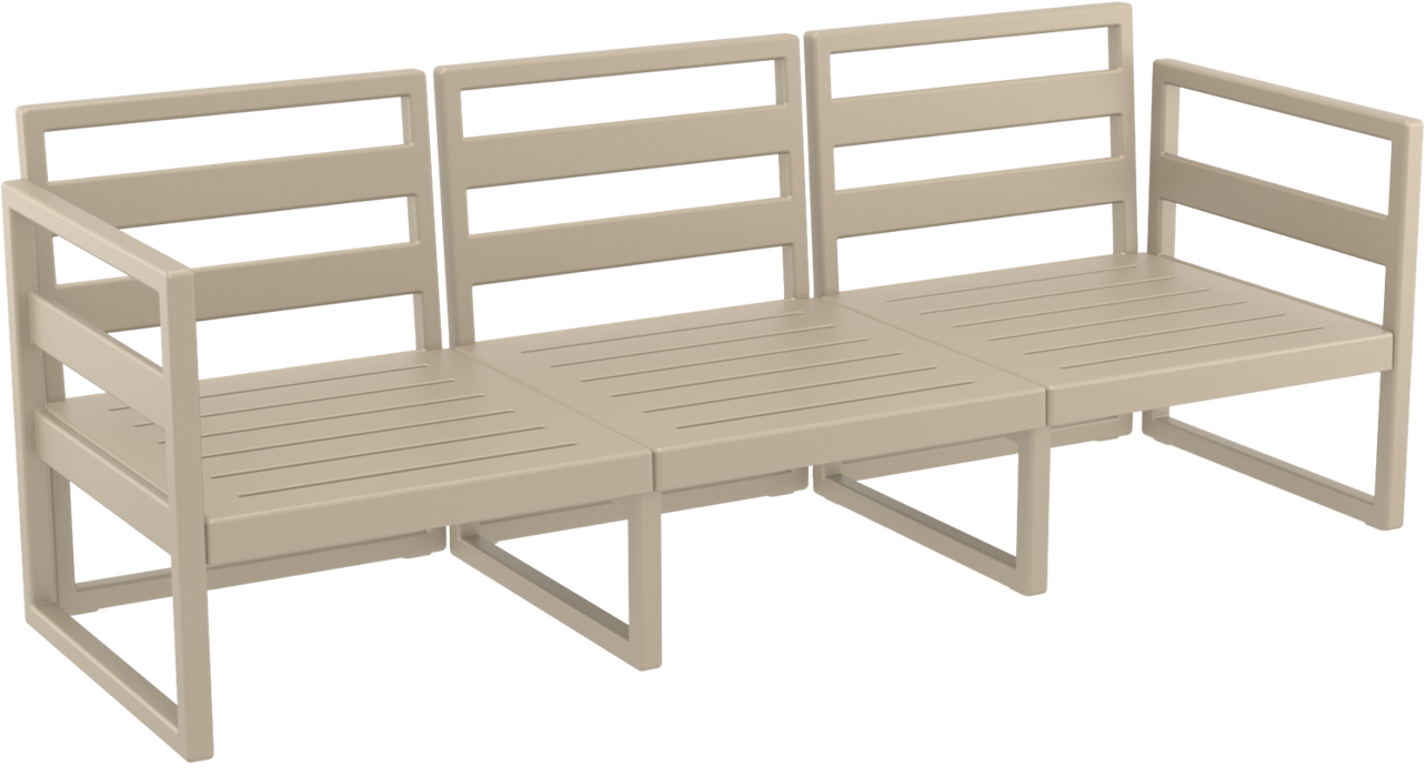 Transform any indoor or outdoor space with the sleek and durable Mykonos Lounge Sofa XL, made in Europe by Siesta with UV-stabilized polypropylene, offering comfort, style, and reliability backed by a 5-year warranty, customizable with optional extension parts and cushions, and environmentally responsible with recyclable materials and production standards.