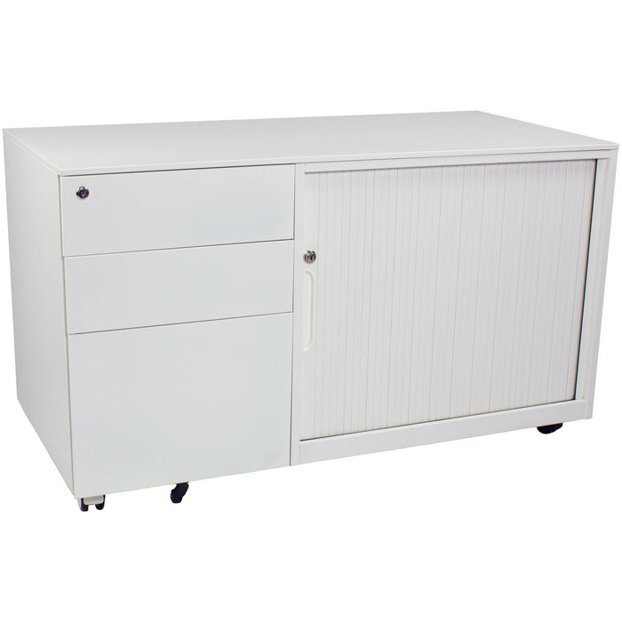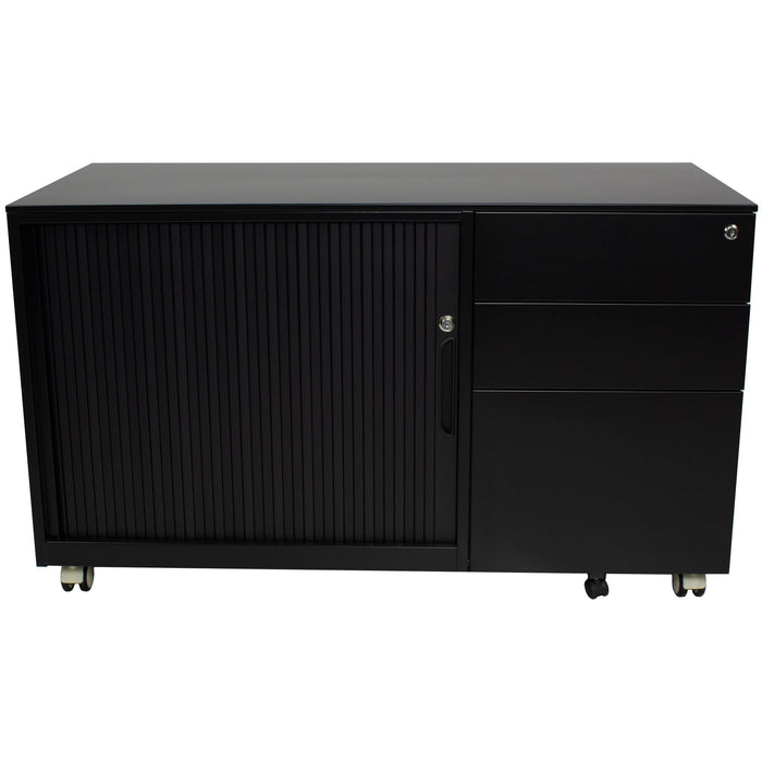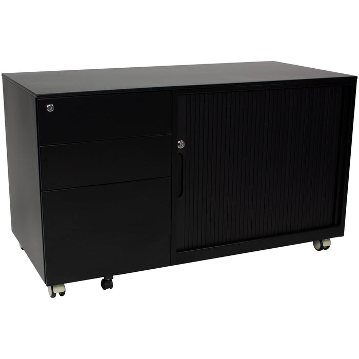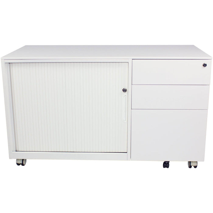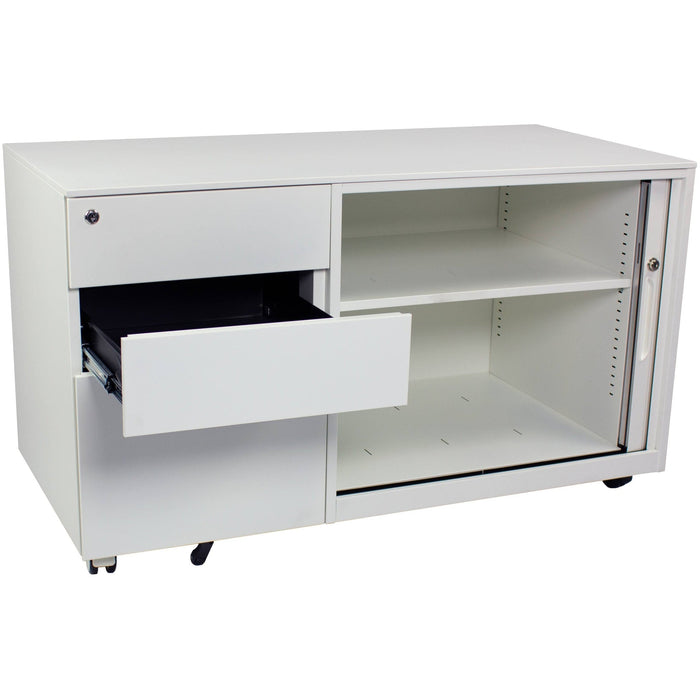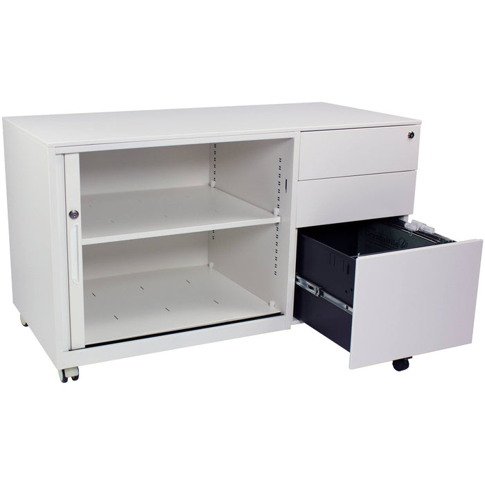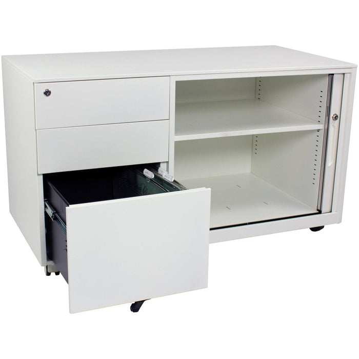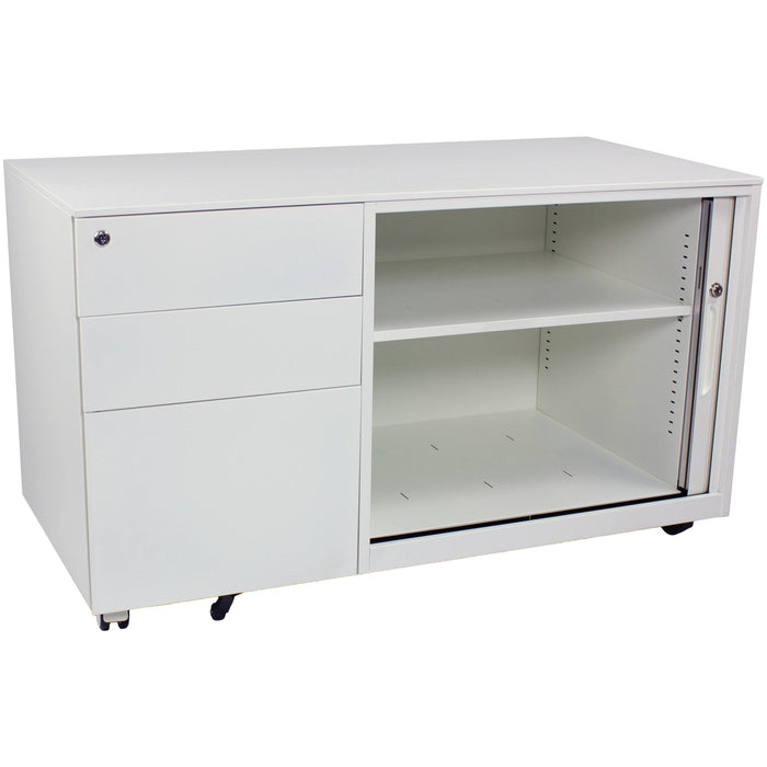 The Steelco Trimline Mobile Caddy is ideal for under desk storage or as an extended workspace storage unit. This unit is available with either a tambour side door or as an open shelf side and features two box drawers and one suspension file drawer.
