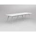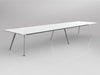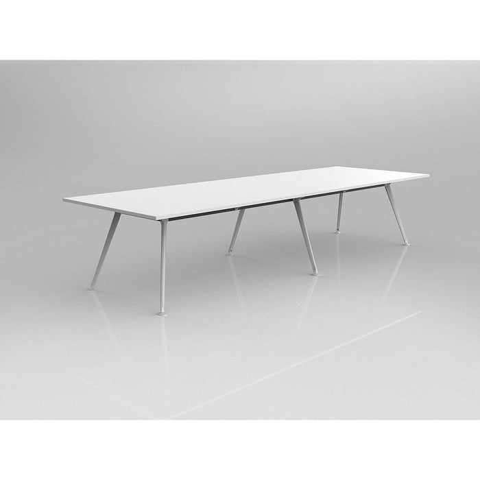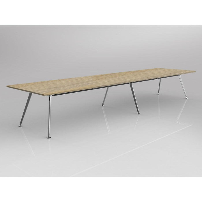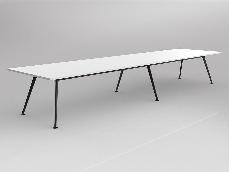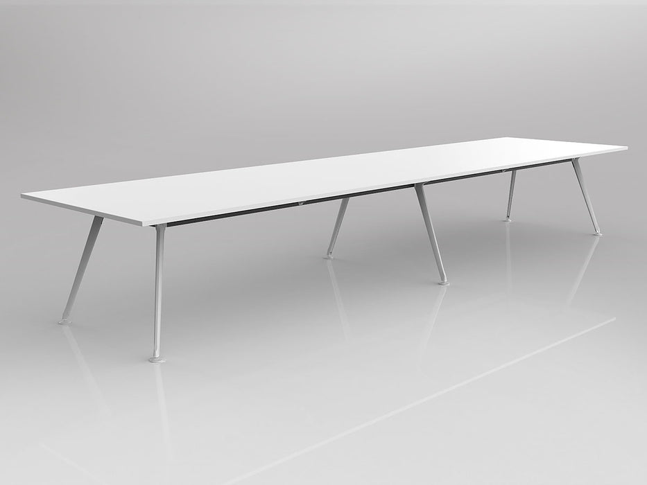 Team Meeting table complete with worksurface size of 3600mm x 1200mm or 4800mm x 1200mm. Black or white powdercoated or polished alloy 6 leg Double span construction with black top rail. 2 piece 25mm Studio white or new oak worktop with matching ABS Edge. Overall height 750mm with adjustable height glides.